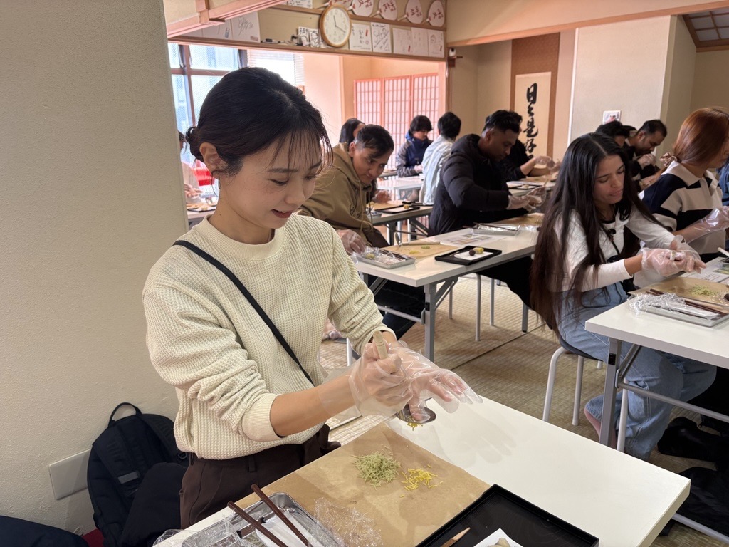 インストラクターさんご指導の下、練って色付けをして…というところが、張り切った学生が色付けのための粉を全部使ってしまったり、2つの和菓子の材料を1つで使い切ってしまったりと、いろいろありましたが、みんな無事に2種類のお菓子を作っていました◎